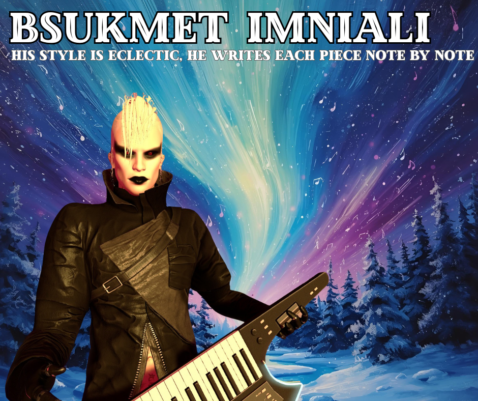 Bsukmet began his musical journey at the age of six, studying piano and musical theory at an academy and taking exams through the Toledo Conservatory. From a young age, he performed piano concerts in various locations, showcasing a classical repertoire. In 2006 he joined the Madrid gothic pop rock band Evil Thoughts, as keyboardist and lead songwriter. Together with them he wrote 2 albums, the second composed entirely by him. In 2019 he started showing his own creations in Second Life. Since then he has released 6 solo albums: “Zero”, “Third Demise”, “Shattered, Almost Detached”, “Imniali: Forced Perspective”, “The Dawn Of A New Nothing” and “Flesh Covered Engines, in addition to the “Silent Beauties” album, in collaboration with the violinist Fly Kugin, the orchestral compilation album “Synth & Strings”, and “Who Cares” with the sax player Steve Who? Actually he is working on his 7th album “Reality Check”. His style is eclectic, and his compositions are entirely original, created note by note, using only free sound resources for some effects or voices, while deliberately avoiding samples and loops.